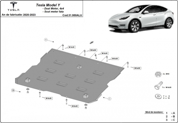 El cubre carter metalico es nuevo y se adapta perfectamente a todas las versiones de Tesla model Y fabricadas entre 2020 y 2023. La placa protega los siguientes: motor eléctrico delantero Está preparado de chapa de Aluminio de 3 mm. Los escudos son de aluminio, pero los soportes de fijación son de acero. Cerrojos, calces y todos los accesorios incluidos. Todas las placas son estrachadas con pintura de polvo anticorrosivo. Las placas del protección del motor son equipados con braceares soldados para resistir mejor a los impactos exteriores. |